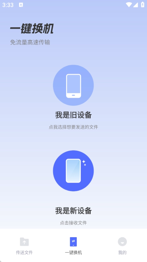 在一键换机流程中,首先在对应页面选择好旧手机与新手机的设备身份,接着通过一键连接完成数据传输。