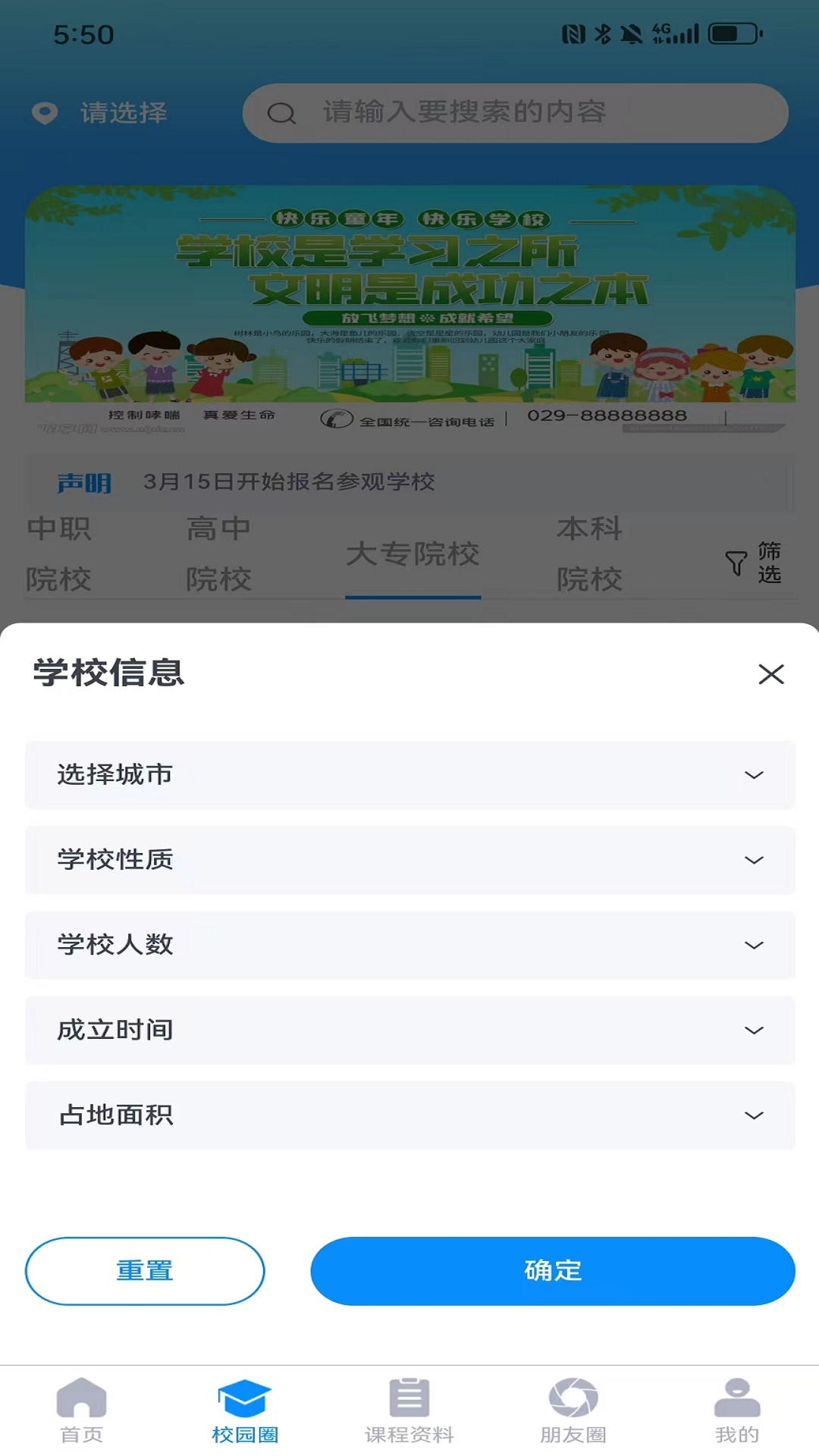 2、搭建详尽的院校数据库,支持依据城市、学校类型、在校生规模等多个维度进行筛选,帮助用户快速查找理想院校,并便捷获取院校的详细信息。