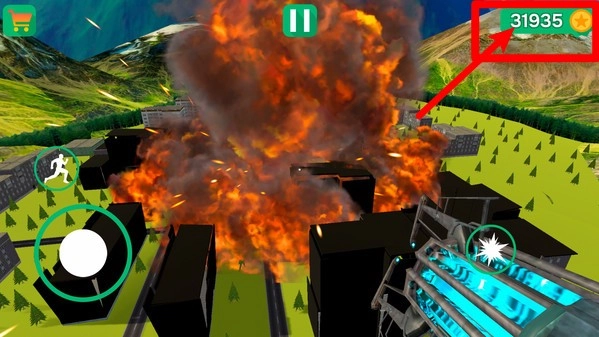 1.金币累计显示:画面右上角的金币数表示当前拥有的资源总量,完成爆破任务后可获得金币,用于解锁更多建筑与武器。