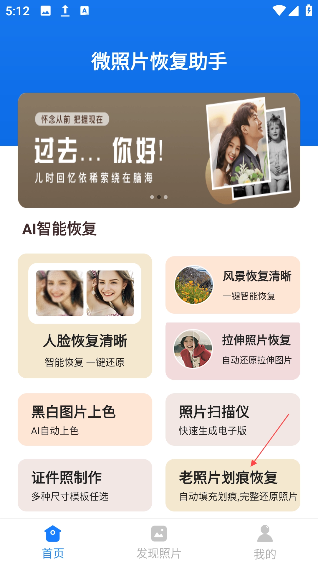 2、进入首页,点击“老照片划痕恢复”图标。