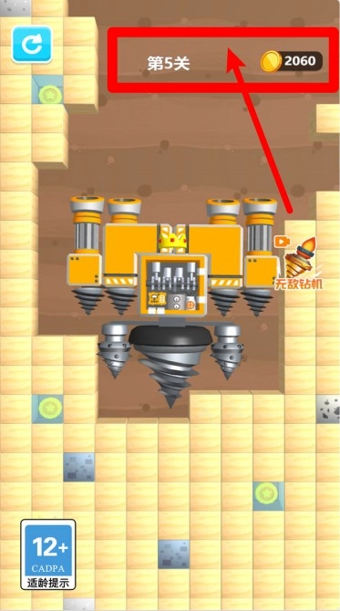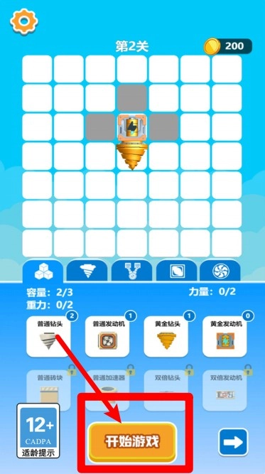1. 点击“开始游戏”按钮进入挖掘界面后,玩家可以先对钻头、发动机以及其他组件进行配置,完成组装操作后,就能正式开启挑战模式。