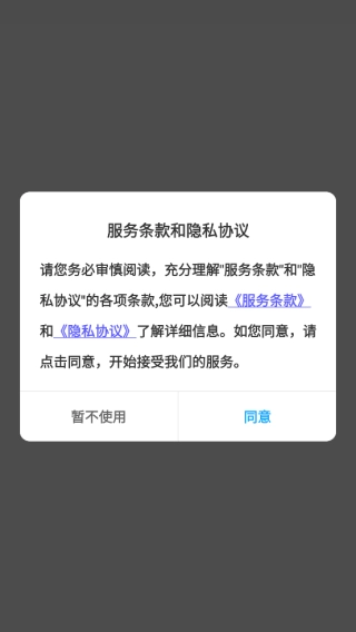 安装完成后打开该软件,首次启动时需要阅读并同意隐私权限相关协议。