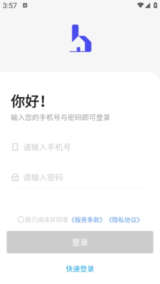 同意协议后会自动跳转到登录界面,您可以通过输入手机号和验证码来完成快速登录。