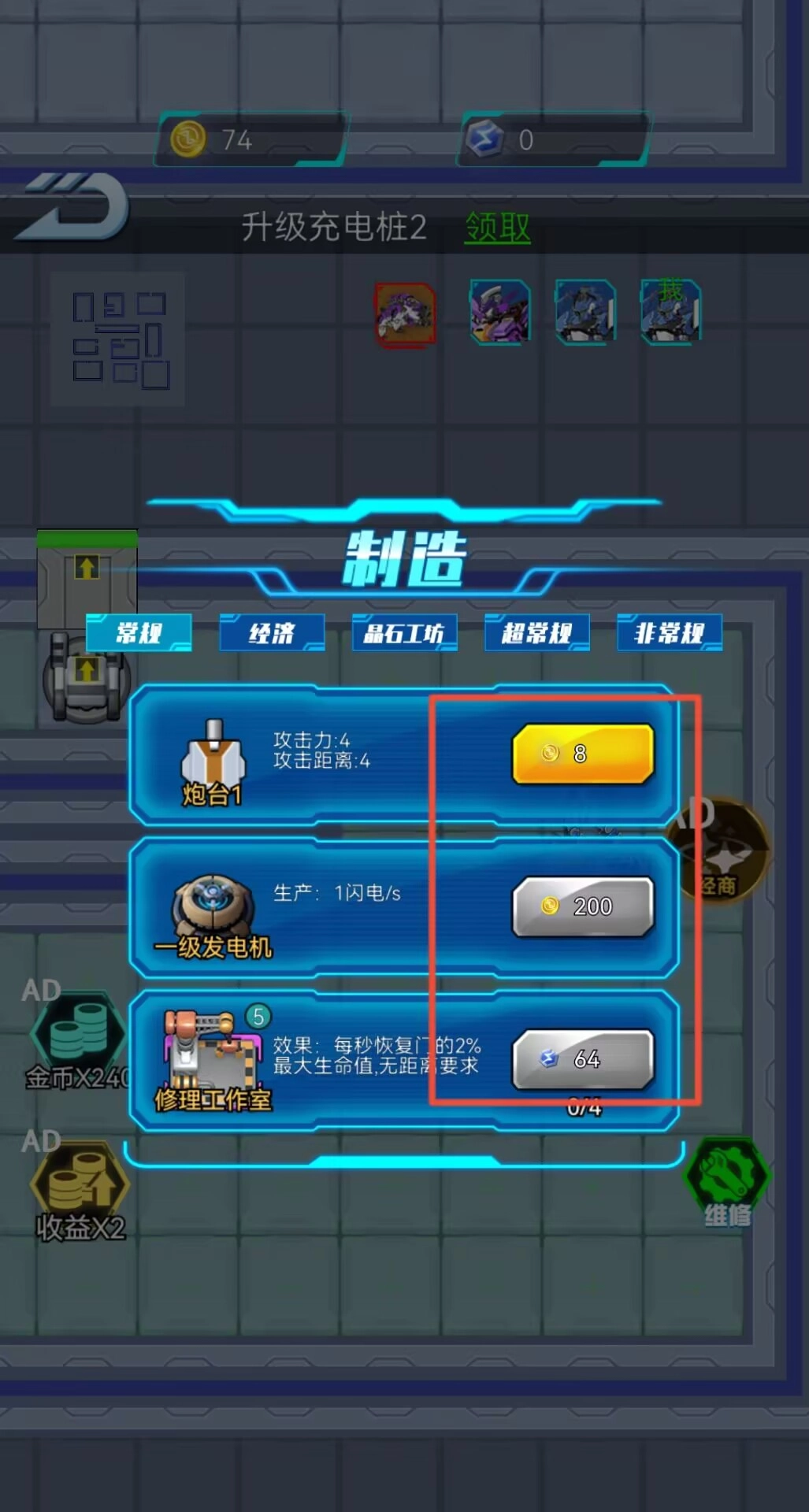 3、在房间里找到能源节点后,能够对防御设施进行强化,还能提升炮台的等级,借助制造界面则可以加快经济资源的生产效率。