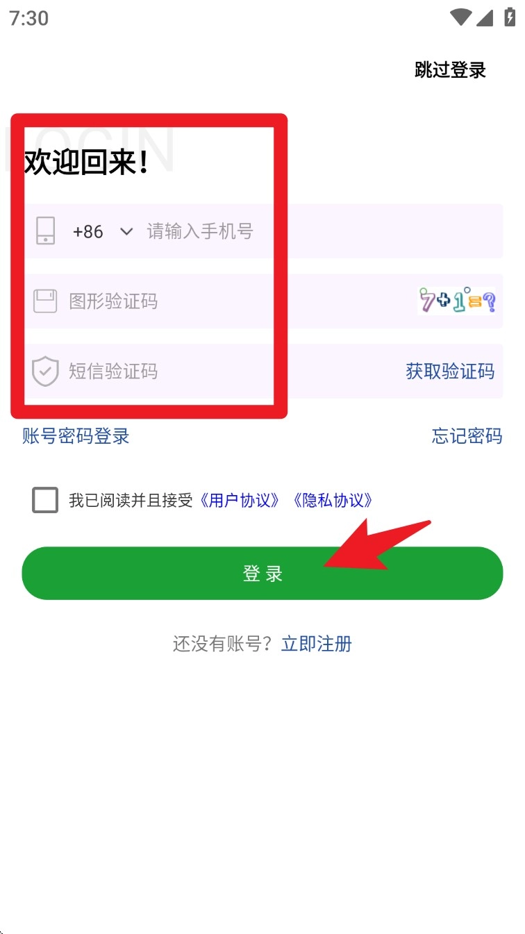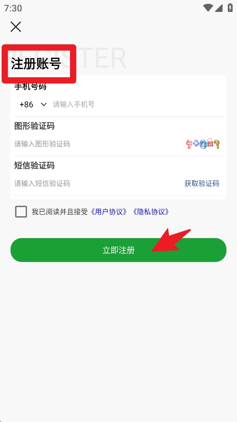 打开App后,先点击「注册账号」选项;接着按顺序填写手机号、图形验证码和短信验证码;之后勾选相关协议,最后点击页面底部的绿色按钮,即可完成账号注册流程。