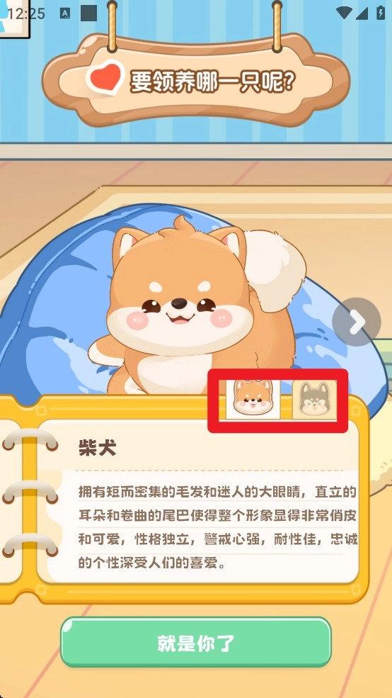 2. 在领养页面挑选你喜欢的狗狗类型,查看介绍后点击“就是你了”完成选择。