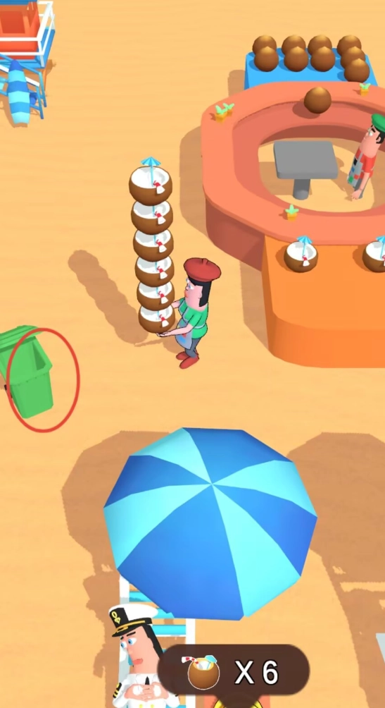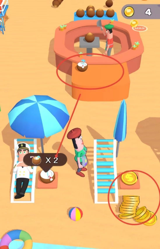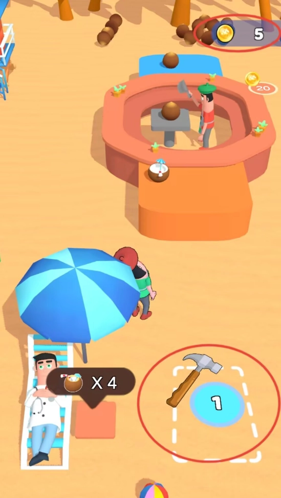 2、店铺运营时要先采集椰子原料,由员工进行加工处理后,再搭配沙滩椅设施,就能为游客提供相应的商品服务了。