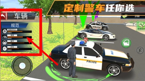 3.车辆属性调整:玩家能通过车辆面板查看抓地力、速度、操控等各项性能参数,可自由调整配置来强化警车的表现。