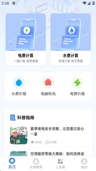 能一键完成水电费的计算,水价、电价以及各类电器的耗电情况等数据都会清晰呈现,页面最下方还包含了夏季用电的科普知识。