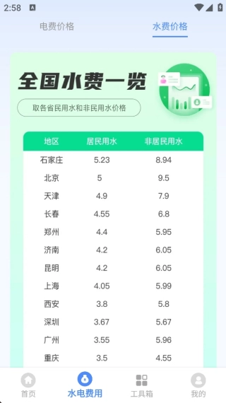 用户若想了解水费相关情况,点击“水费价格查询”即可——这里汇总了全国各省的用水价格,方便大家对比实际价格是否存在差异。