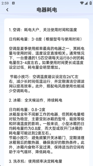 很多人可能对一些家用电器的耗电量没什么概念,这款软件里就把当下使用频率较高的家电用电情况展示出来了。