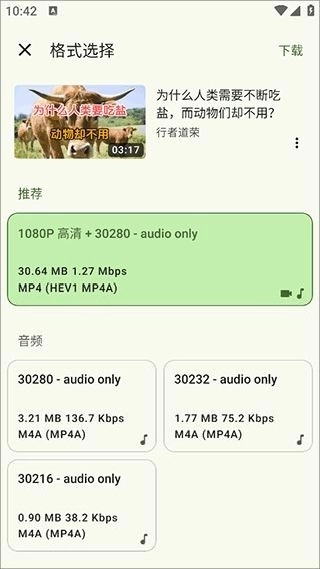 链接分析完成后,应用会呈现出可选择的视频与音频内容,你根据自身需求勾选相应选项就可以了。