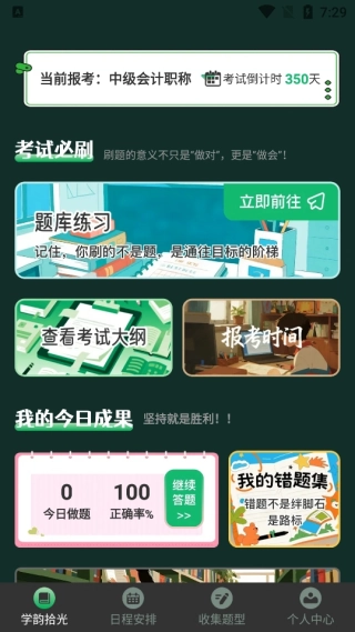 首页推送的资源十分丰富,涵盖学习内容、学习大纲、日程安排以及题库搜索学习等功能。