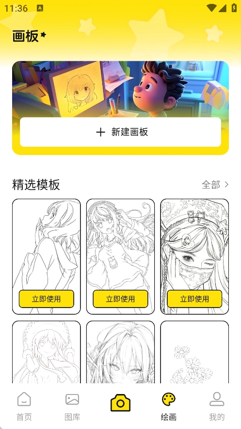 3、绘画功能支持新建画板以便随时创作,也提供模板供用户选择进行绘画。