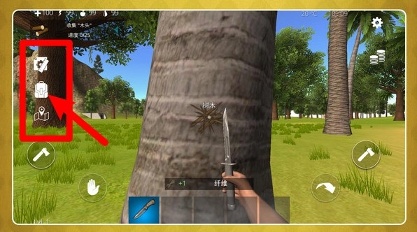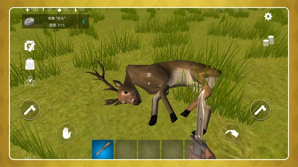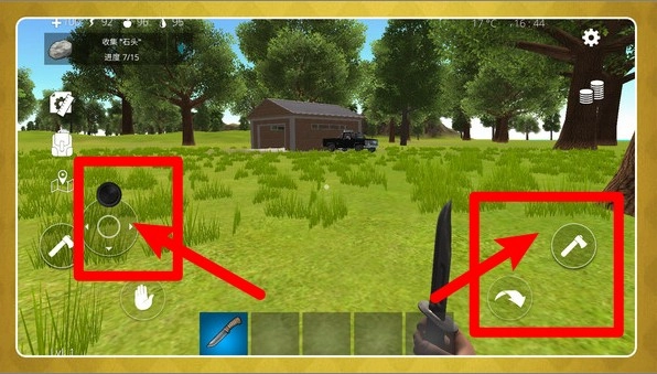 3.左下虚拟摇杆控制移动,右侧为工具与攻击键;根据环境快速切换刀斧等采集武器,留意体力与背包容量避免负重过高。
