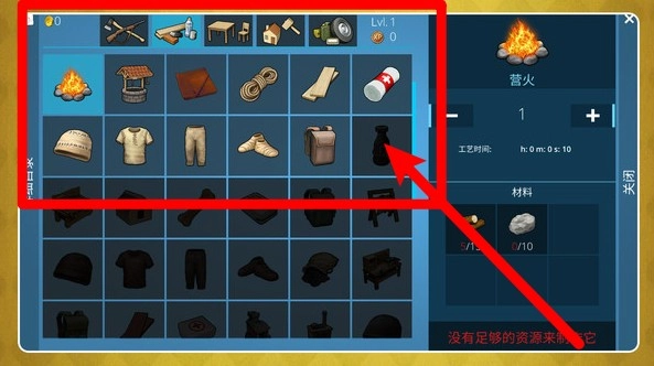1.制作界面左侧为配方与物品栏,箭头所示选中可查看右侧详情;可见营火需石头十个与制作时长,材料不足会提示无法建造。