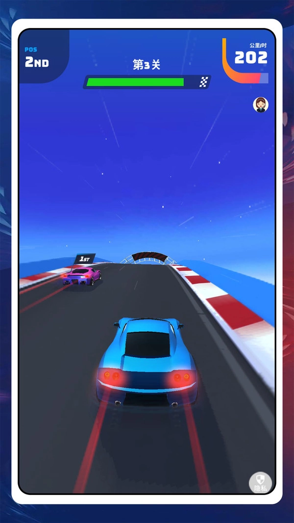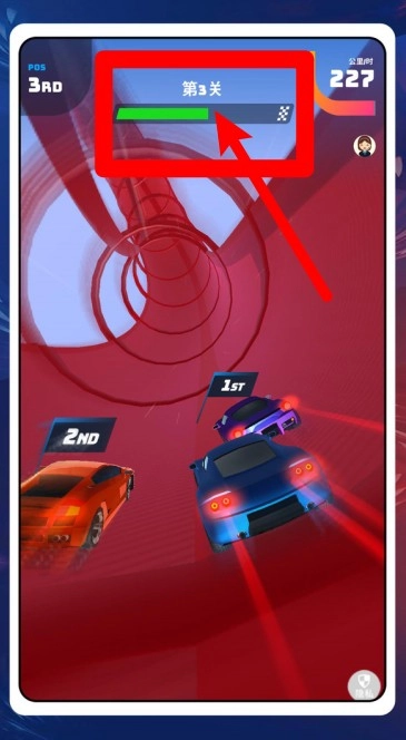 2.顶部显示“第3关”的赛程进度条,绿色代表已完成距离,右侧方格旗为终点;依据剩余路程合理开启氮气与出弯加速超车。