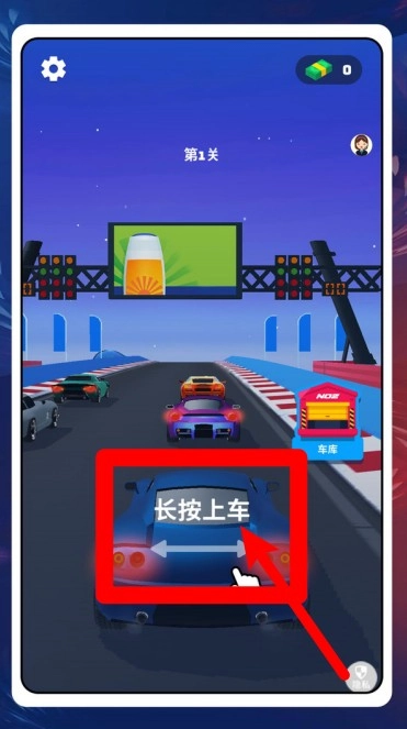 3.起跑区提示长按上车,右侧进入车库;按住完成登车后,在绿灯瞬间全油门冲出起点。