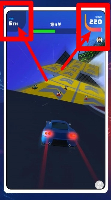 1.左上显示名次与进度条,右上是速度与头像;保持路线稳定,利用弯道内线加速超越对手。