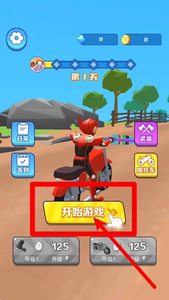 1.主界面点击开始游戏进入比赛,左侧签到与任务可领取资源,武器和摩托入口支持升级强化基础性能。