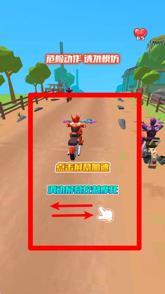 2.点击屏幕加速,左右滑动控制车身,避开碎石与对手,保持在赛道中心,抢占最佳走线安全提速冲刺终点。