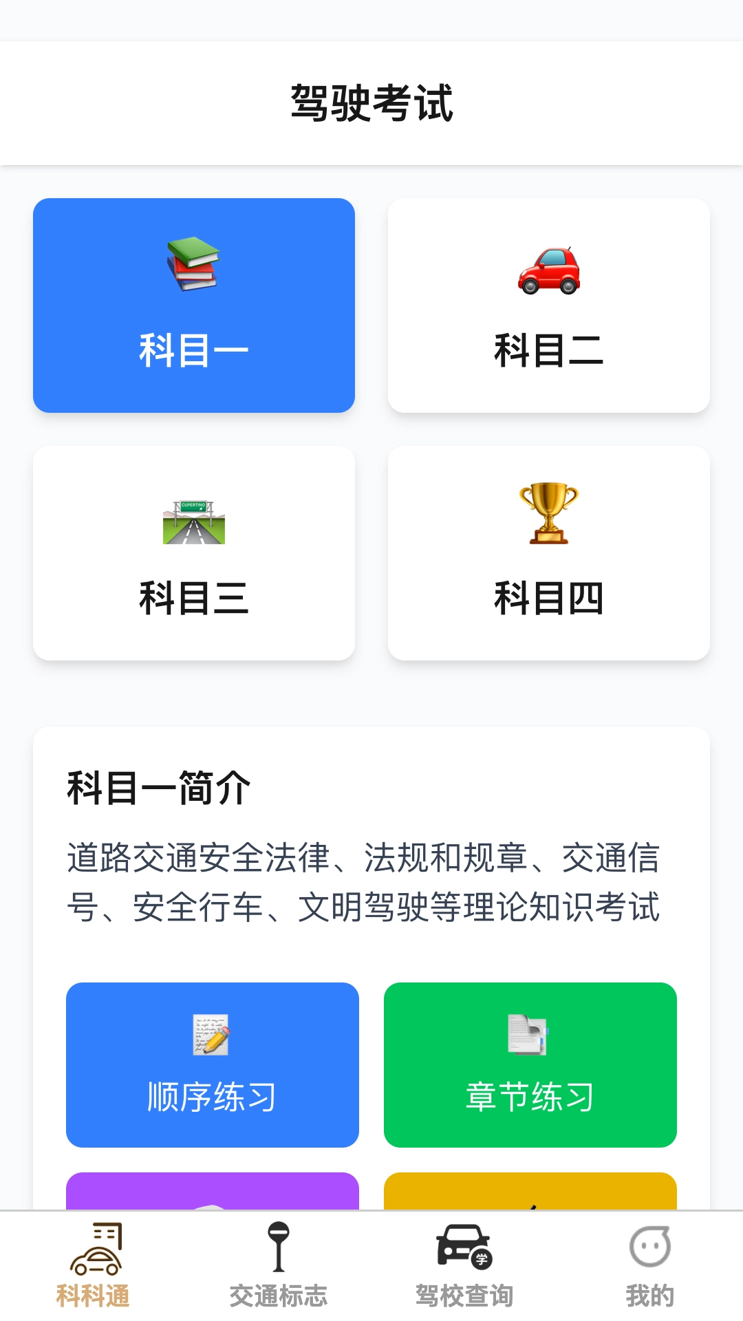 首页设有科目一到科目四的版块,各版块的内容或许存在差异。