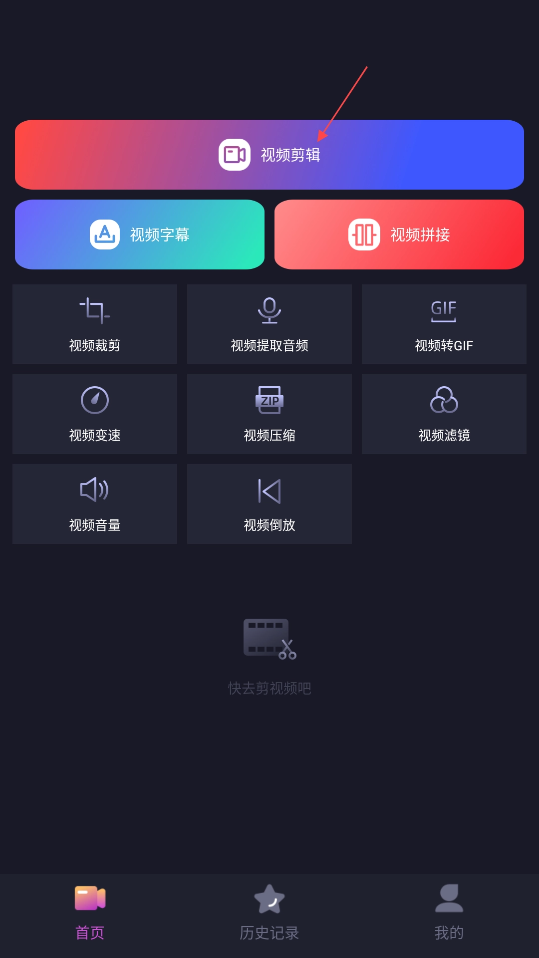 2、打开首页后,找到并点击“视频剪辑”图标,接着导入待剪辑的视频文件。