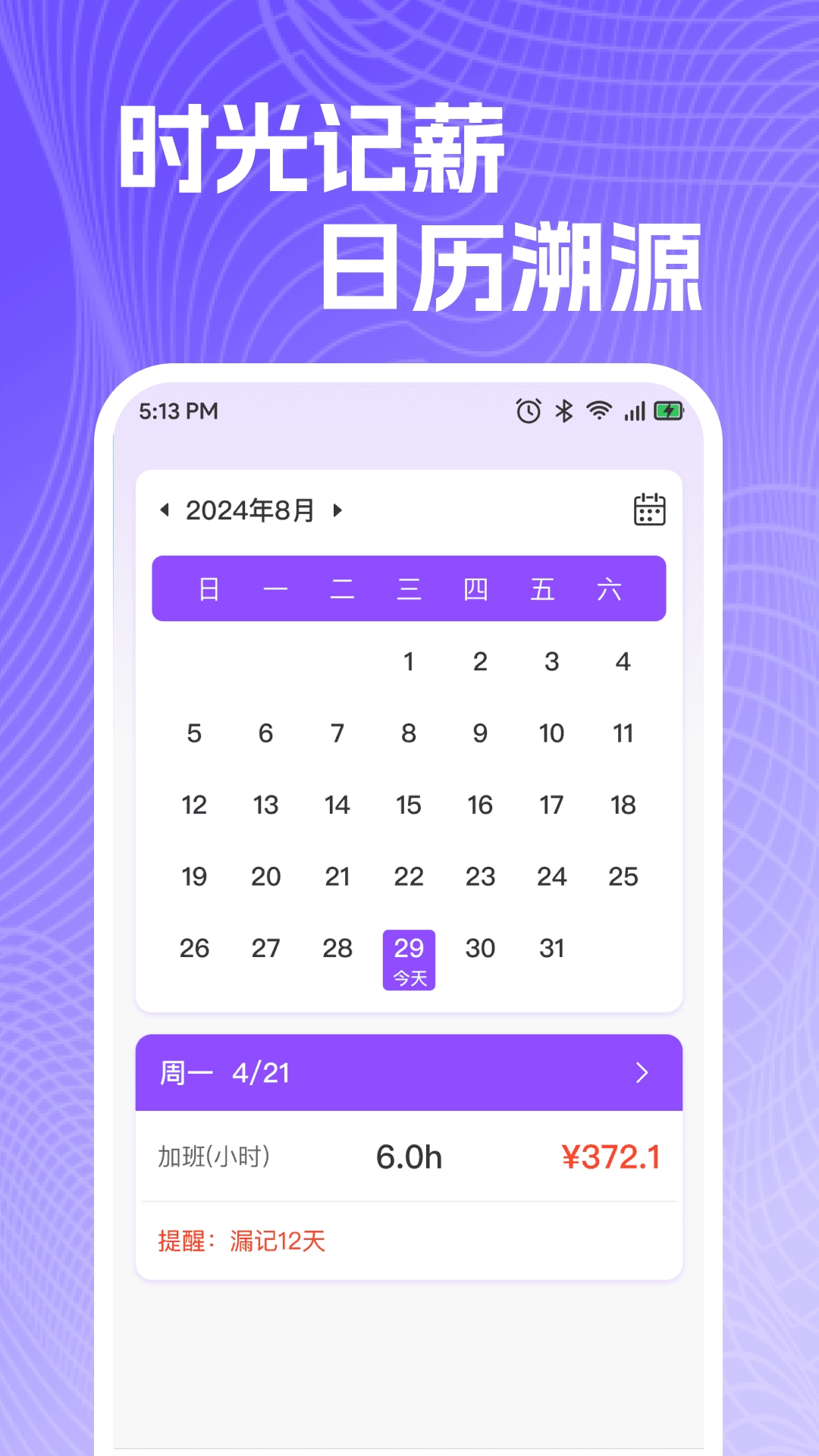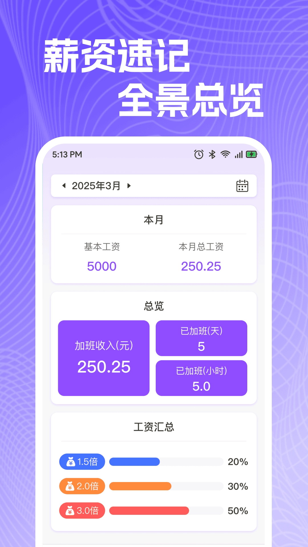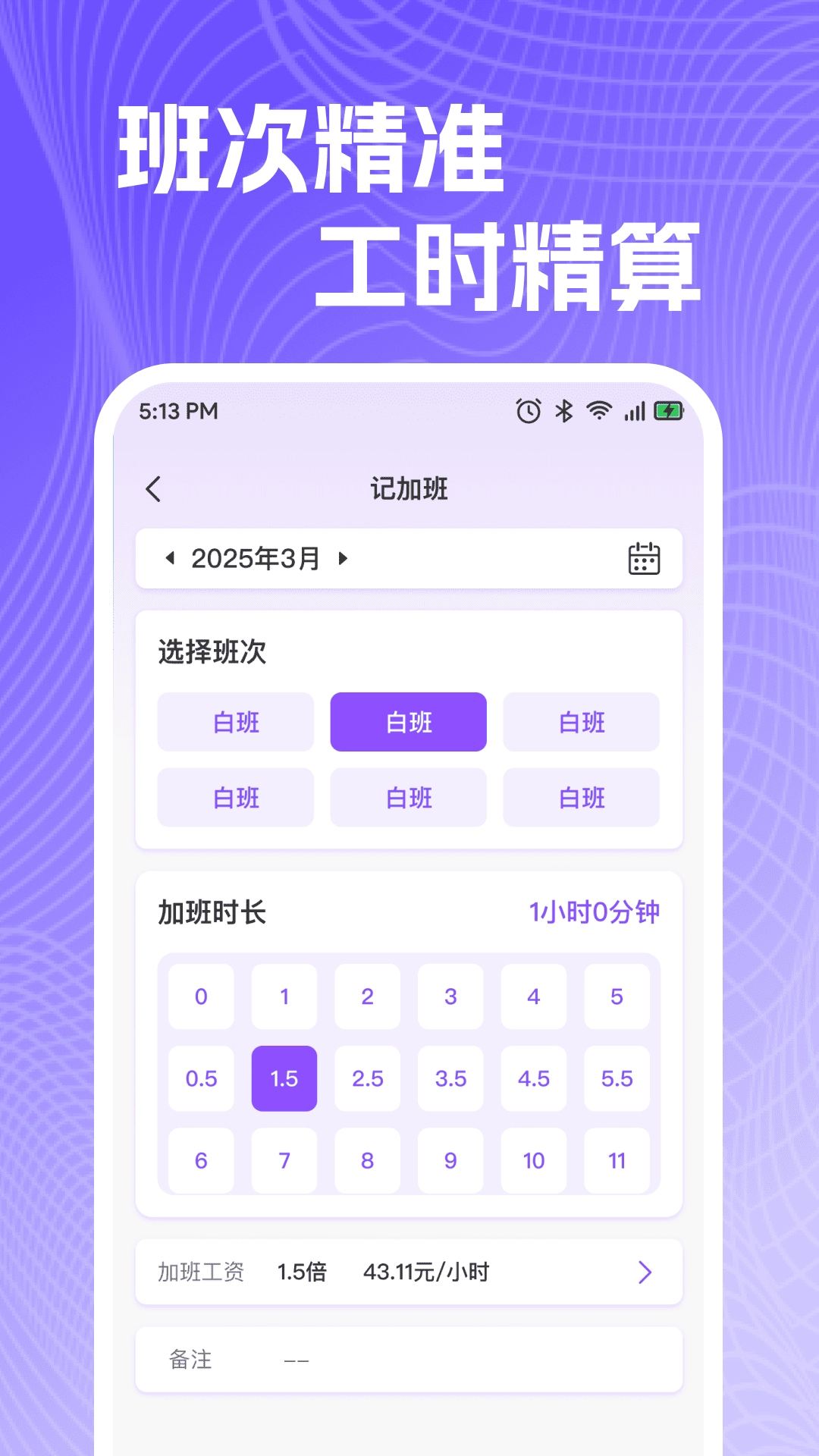 1、支持多种工资标准设定,能够记录每日加班时长,并允许用户灵活补录历史数据。