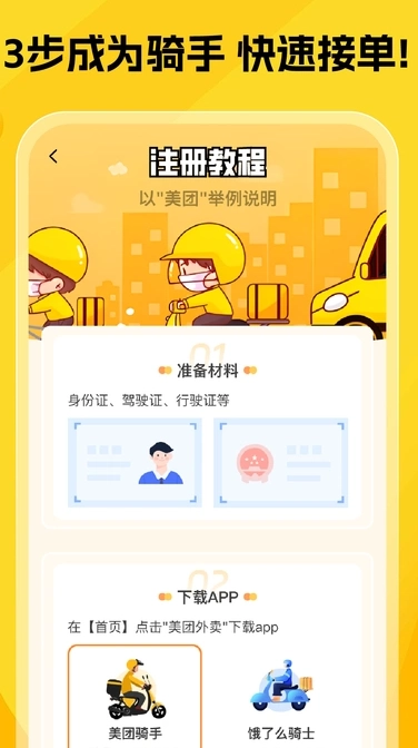 2、即使是首次接触众包平台的骑手,也能轻松完成注册,快速融入美东外卖配送大家庭。