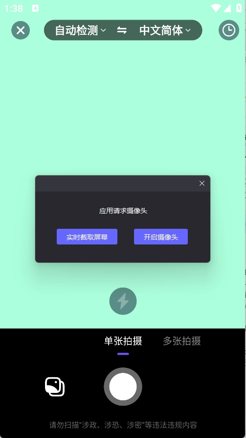 2、在拍照页面中可以进行单张拍摄或多张拍摄进行翻译;