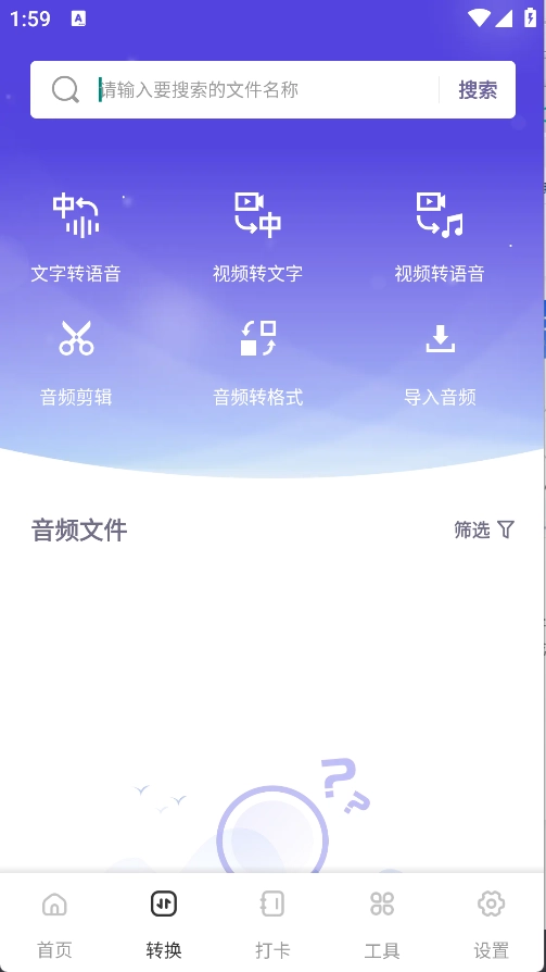 2、转换页面包含文字转语音、视频转文字、视频转语音、音频剪辑、音频转格式和导入音频等功能选项。