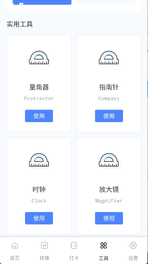 4、工具页面集成了手电筒、量角器、指南针、时钟与放大镜等实用功能。