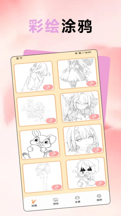 1、首页呈现的是彩绘涂鸦功能,用户能在此临摹各类素材,再依据个人喜好为这些画作上色,画的品类也会持续更新,确保大家能画得愉快;