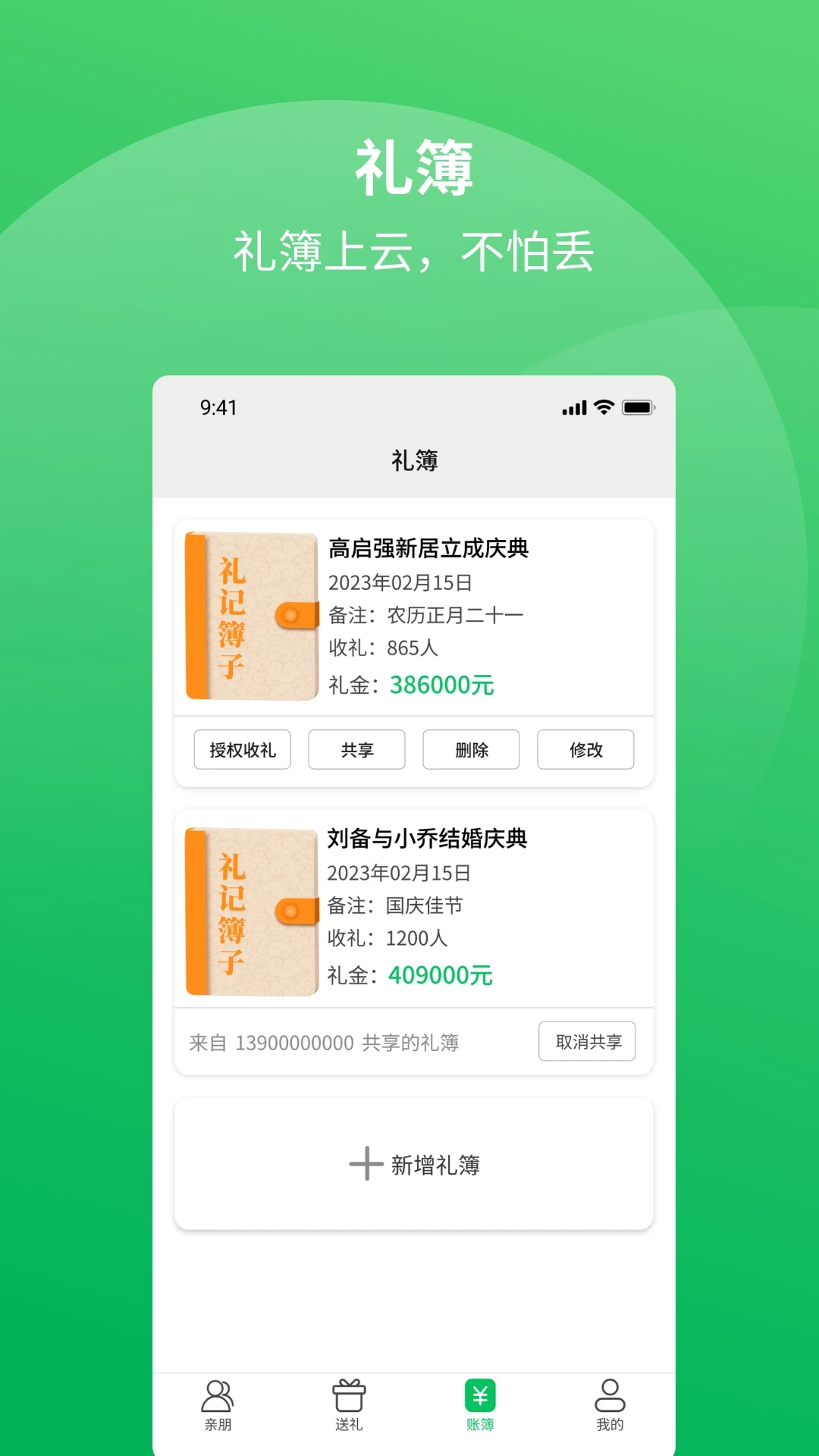 1、礼簿管理功能,支持礼簿的创建、编辑与删除操作,可对不同场合的礼金记录进行分类管理。