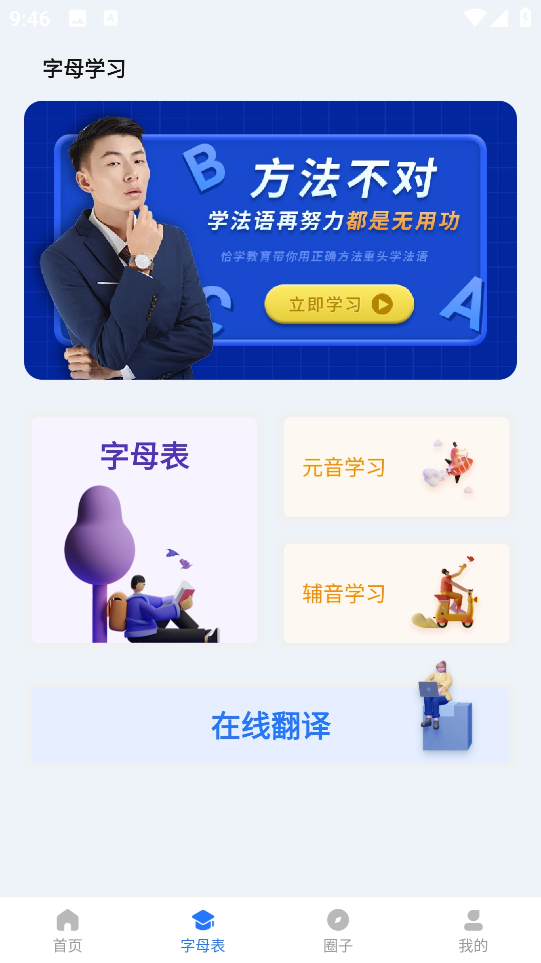 2、点击进入【字母表】界面,打开【在线翻译】页面。