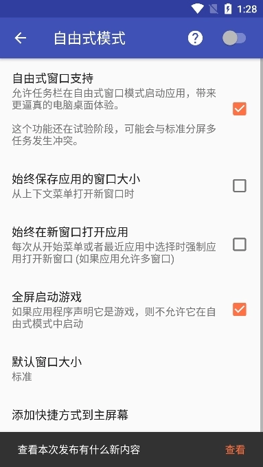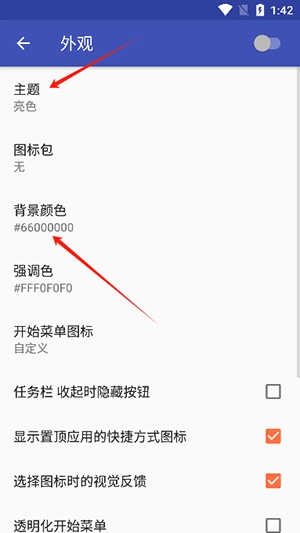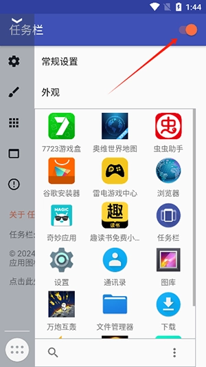 Taskbar任务栏是一款可以手动调整任务栏状态的手机工具。它支持外观自定义,主题、背景颜色、图标包以及开始菜单图标都能自由设置。此外,用户还能调整菜单布局,有列表和网格两种样式可供选择。