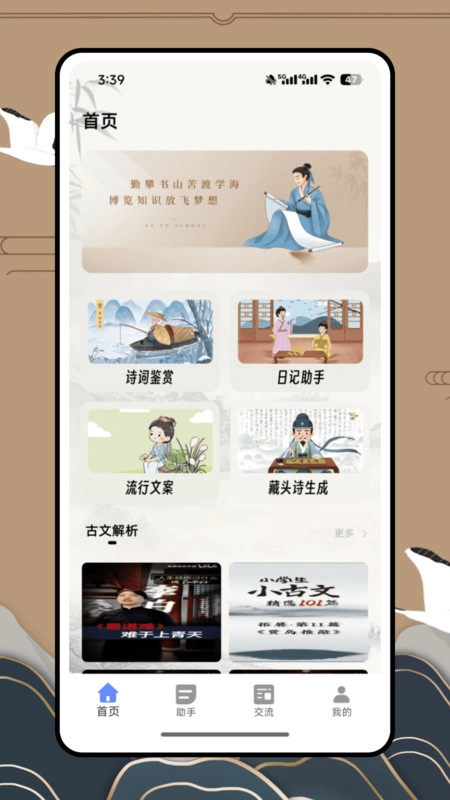 首页包含诗词鉴赏、日记助手、流行文案、藏头诗生成等功能模块。