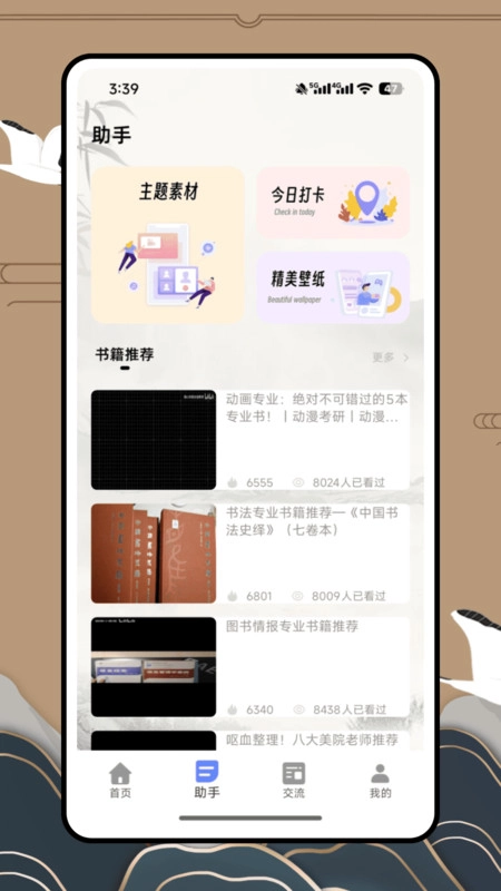 2、助手页面整合了主题素材、今日打卡、精美壁纸等资源,同时也包含各类书籍推荐等信息。