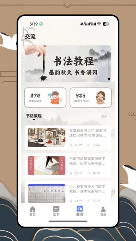 3、交流页面里设有猜字谜、纪念日板块,此外还包含各类不同的书法教程等相关信息。