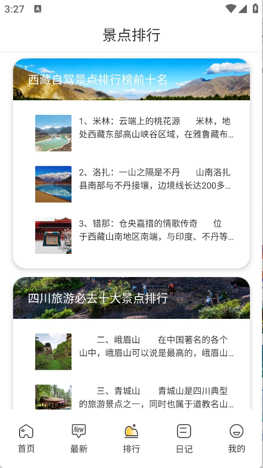 在排行页面中,你能够知晓西藏自驾景点的前十名排行榜以及四川旅游必去的十大景点排行。
