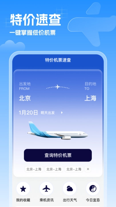 1、特价机票速查旨在帮助用户轻松找到机票。用户只需简单搜索即可快速获取所需的旅行信息,便捷至极,助您轻松安排行程。