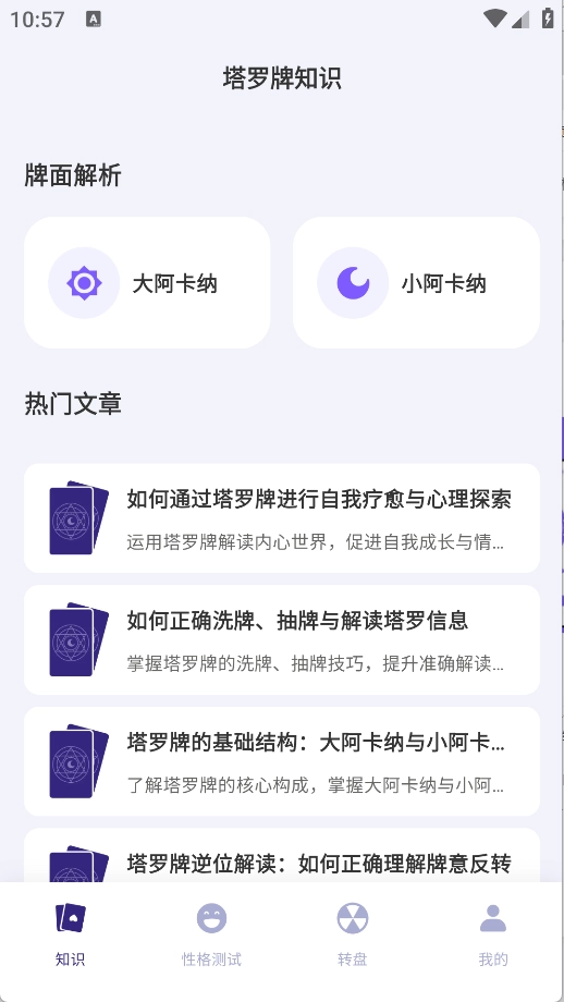 在知识板块里,你能了解到大阿卡纳、小阿卡纳等相关内容,同时也能看到各类热门文章。