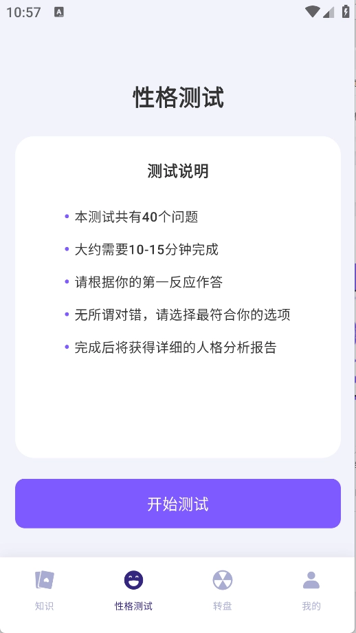 2、性格测试通过完成40道不同的题目来帮助了解自身性格,作答时需以第一反应为准。