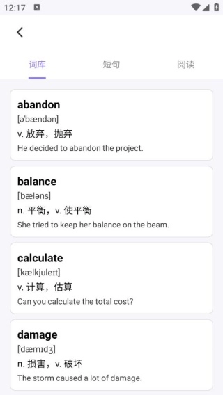 词库界面的单词内容更为丰富,不仅能听到发音,还能了解释义。