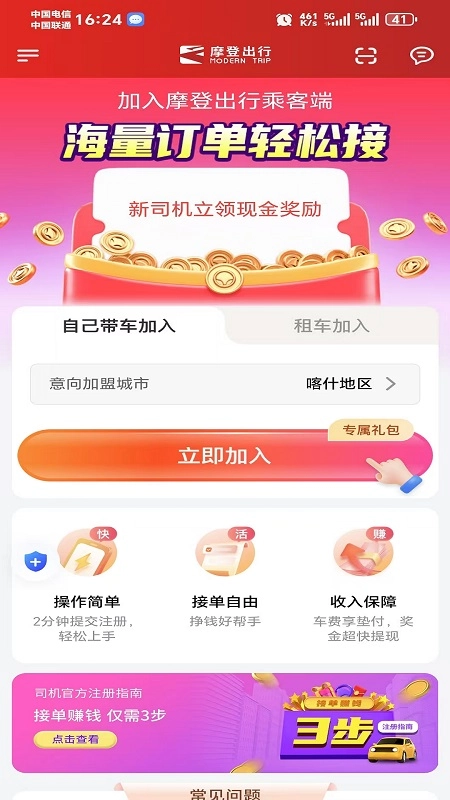 摩登出行软件是一款专为网约车提供接单服务的手机软件,通过整合乘客订单资源,为司机提供接单、导航、提现等一站式服务,助力司机高效赚钱,支持司机自主选择 自己带车加入或租车加入两种模式,适配不同司机的运营需求。