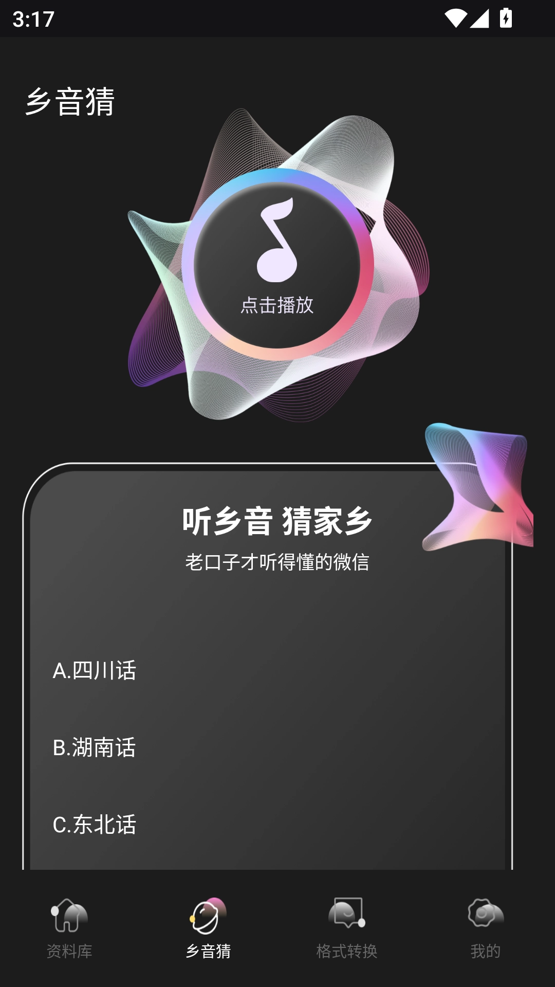 1、涵盖海量方言资源,通过听音频猜方言类型,在娱乐中了解不同地域的语言特色,互动性强。