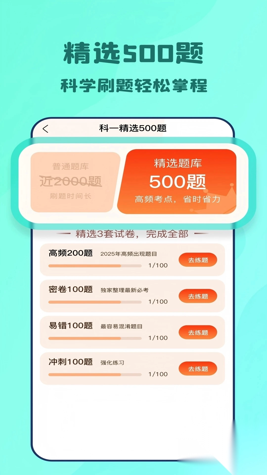 2、配备科一精选500题,助力用户及时在线掌握并了解各类题库信息内容;