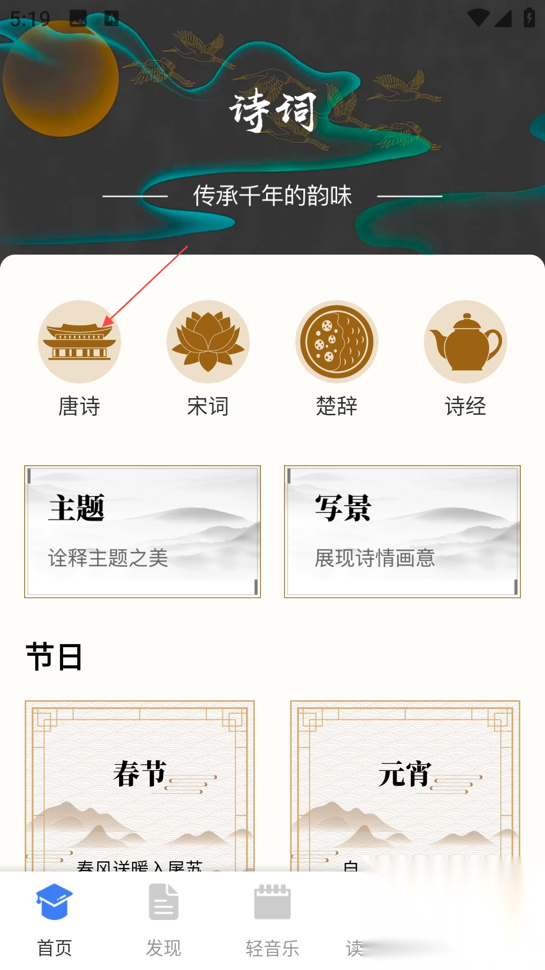 2、浏览诗词分类,点击【唐诗】图标,选择感兴趣的诗。
