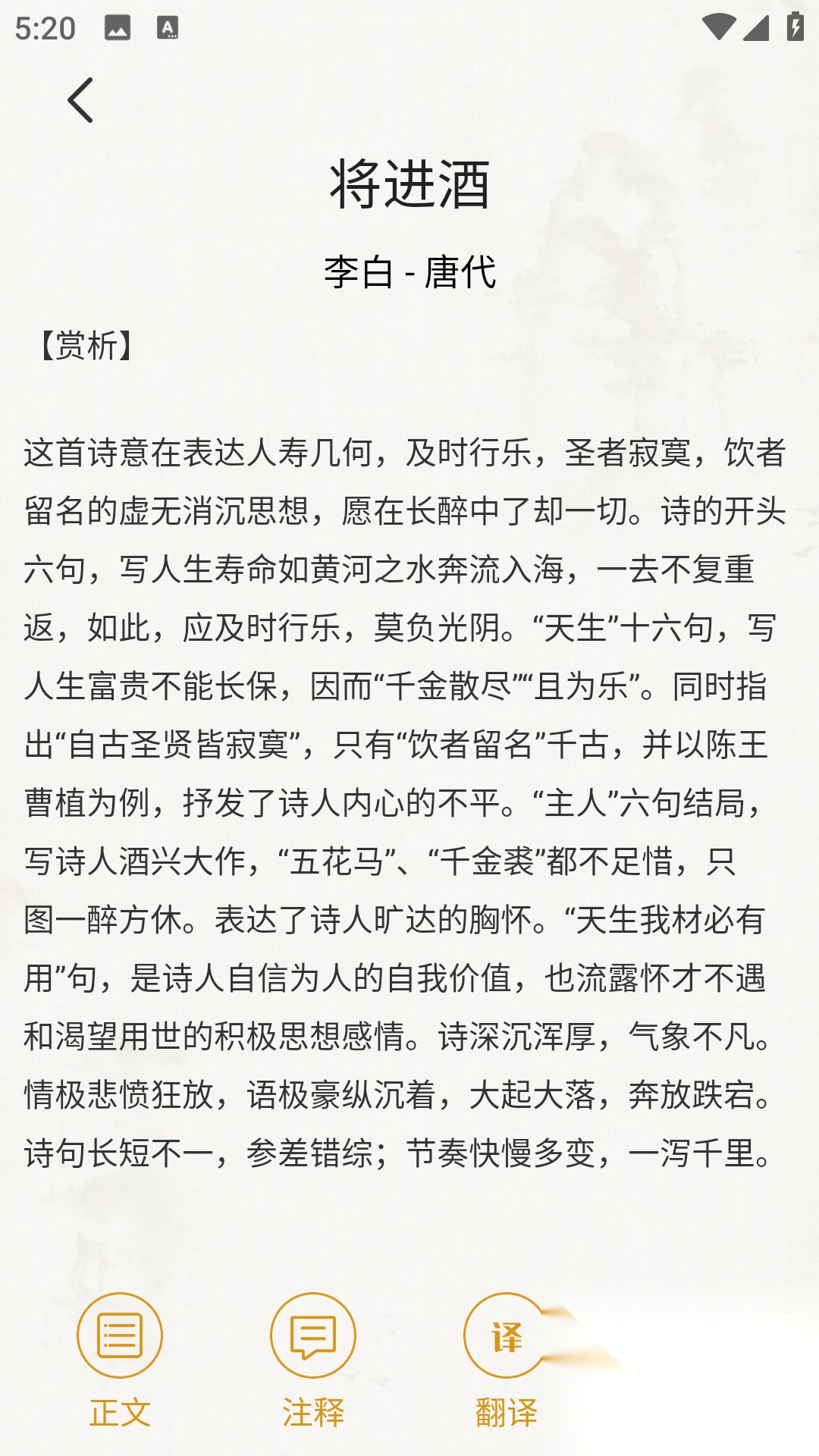 3、打开正文,点击【赏析】按钮,即可查看详细赏析内容。