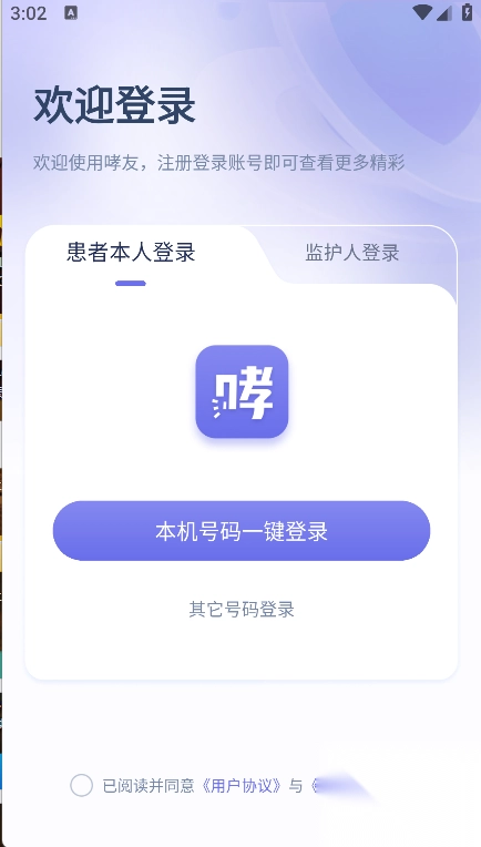 2. 选择患者本人登录,或是监护人登录,点击本机号码一键登录,即可快速登录,开始使用。